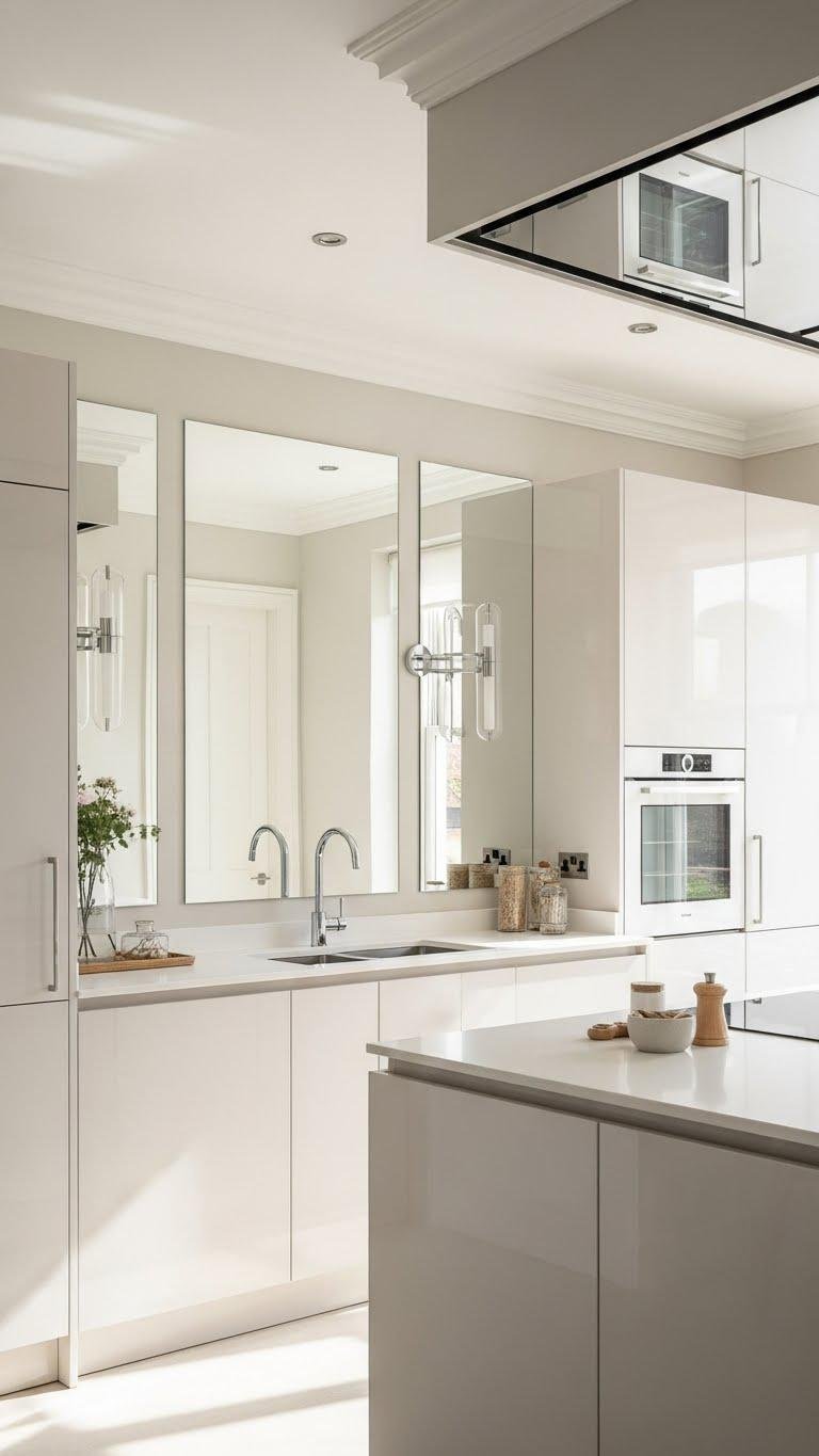 Once you’ve settled on a soft, cohesive palette, bring light further into the space with reflective and glossy finishes that amplify brightness and depth. Choose high gloss cabinetry to bounce light and keep surfaces sleek, pair with a mirrored ceiling or large mirrors to expand sightlines, and select chrome fixtures. These choices feel modern, airy, and liberating without crowding the room.