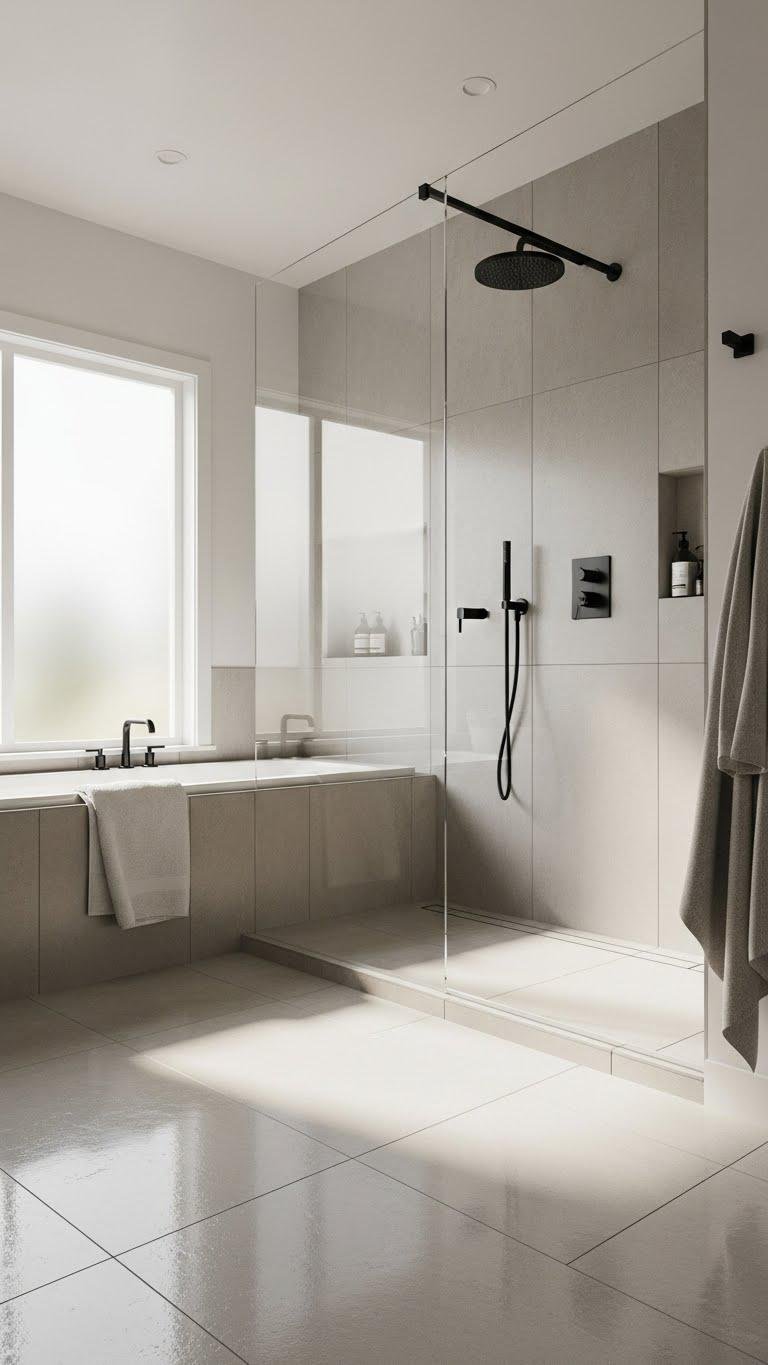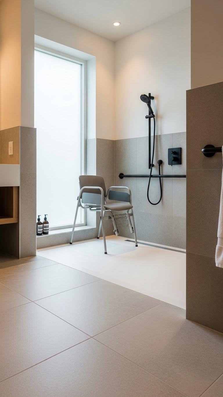 Plan drain placement carefully and consider curb removal for accessibility. You’ll get a minimal, airy retreat that feels liberating and effortless.