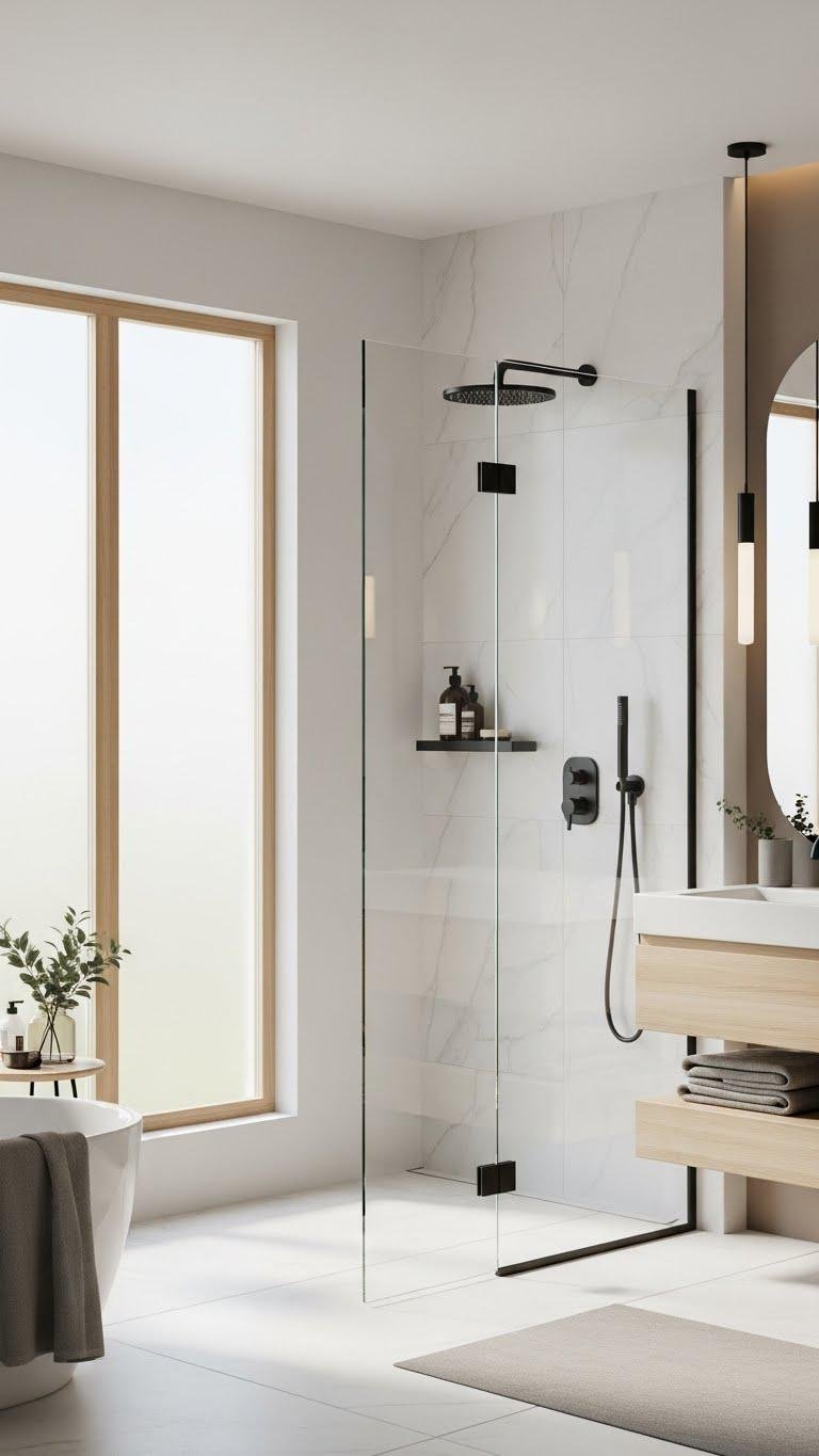 By swapping your bulky tub for a walk-in shower or wet room, you’ll open up floor space, simplify cleaning, and give the bathroom a sleek, modern edge. Choose seamless glazing, large-format tiles, and bold fixtures so the room breathes.
