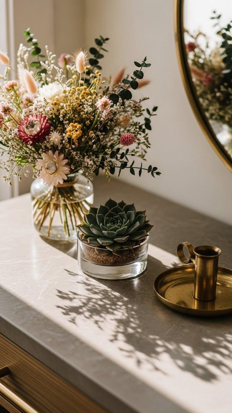 You’ll choose a dried wildflowers arrangement for effortless charm or a mini succulent centerpiece for low-maintenance calm. Mix glass vases and brass accents, keep proportions simple, and rotate blooms seasonally.