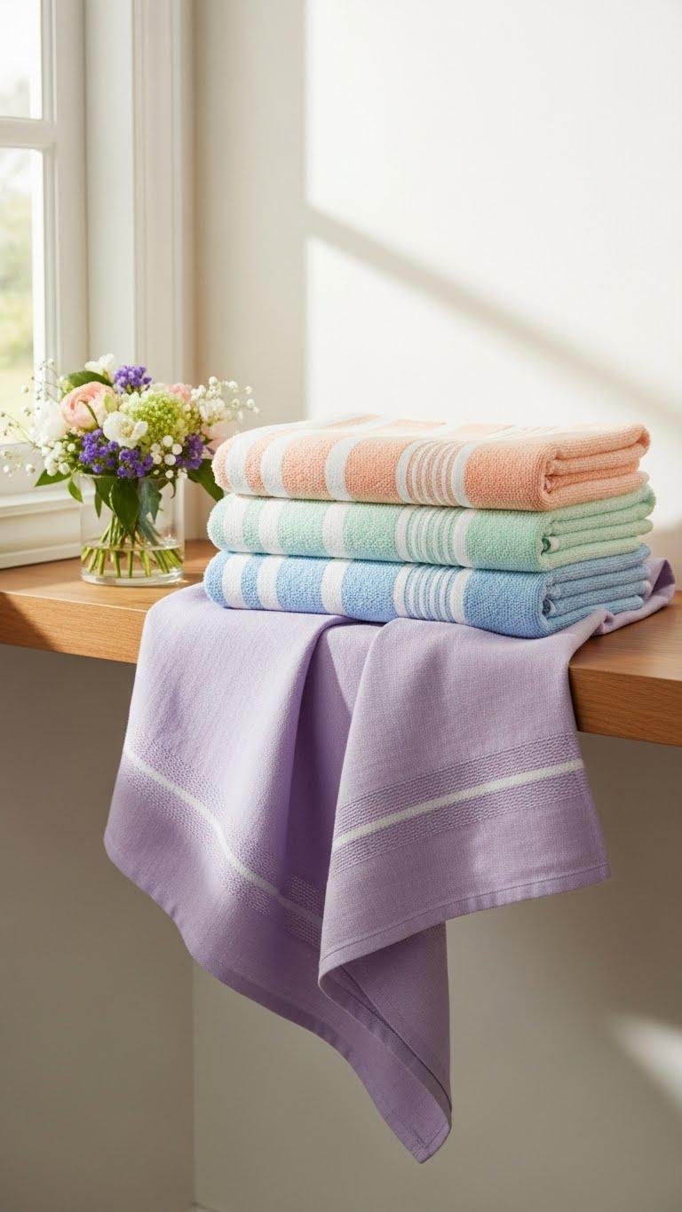 Pair your floral centerpiece with a simple towel swap to carry that spring feeling through the room. Choose pastel towels in soft stripe patterns and a lavender linen hand towel to anchor a calm, liberated vibe. You’ll refresh texture and color instantly; rotate hues seasonally, mix solids with subtle patterns, and let clean lines keep the look airy and effortless.