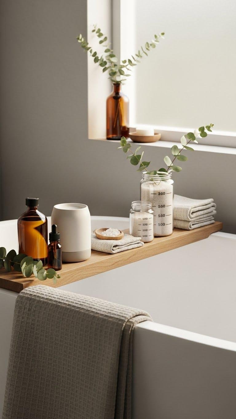 Serenity settles when you step toward a freestanding tub dressed with aromatherapy essentials—plant-based bath oils, a simple ceramic diffuser, and a small stack of linen washcloths—so your soak feels curated, not cluttered. You’ll add aromatic eucalyptus sprigs, measured bath salts, and a minimalist wooden tray. Let scent steer your ritual; choose quality, embrace simplicity, and reclaim calm in your space.