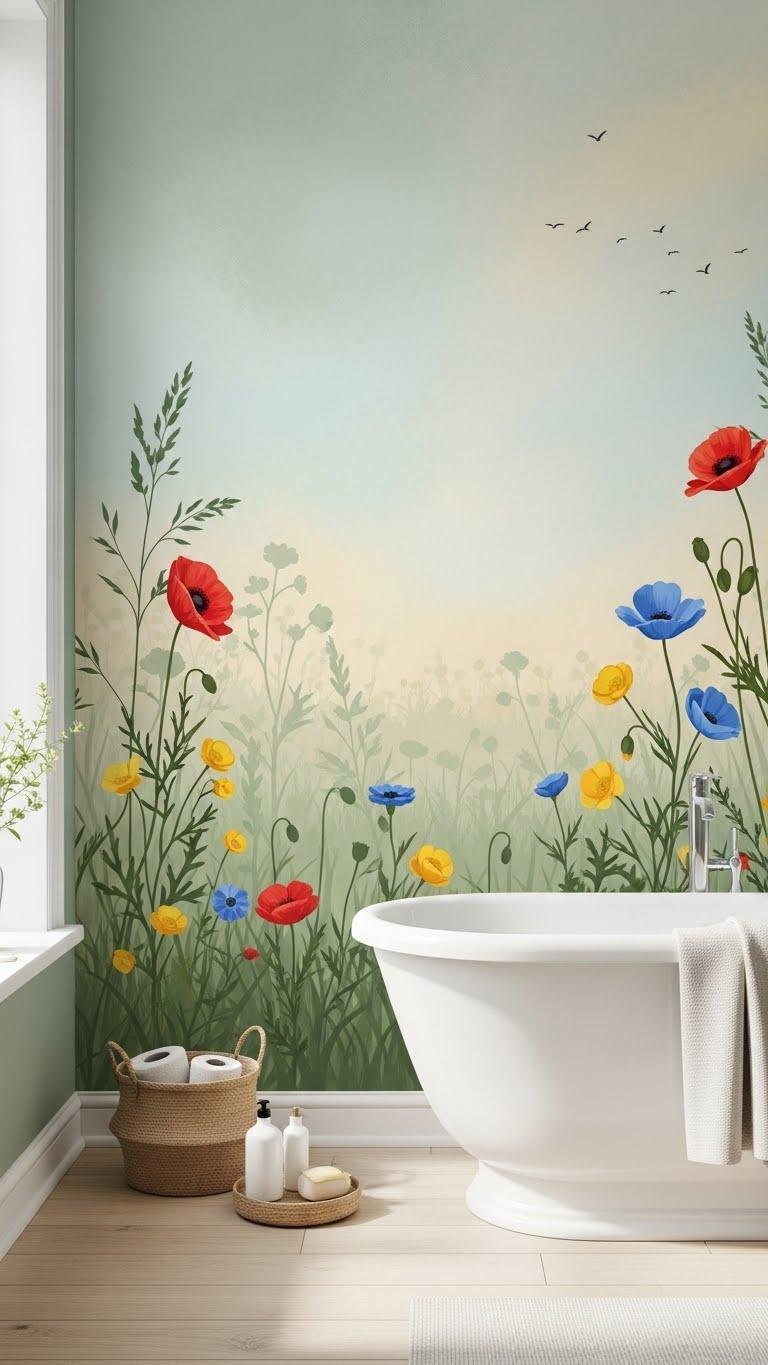 If you want to bring the outdoors in, a wall decal or mural of a wildflower meadow instantly transforms your bathroom into a fresh, uplifting refuge.