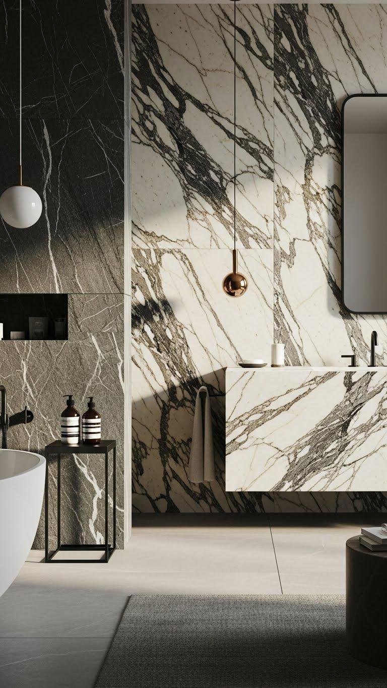 Choose textured slate or marble with dramatic veining to create a liberated, gallery-like space. You’ll command attention with minimal accessories, letting raw stone textures and bold patterns define a confident, free-spirited bath.