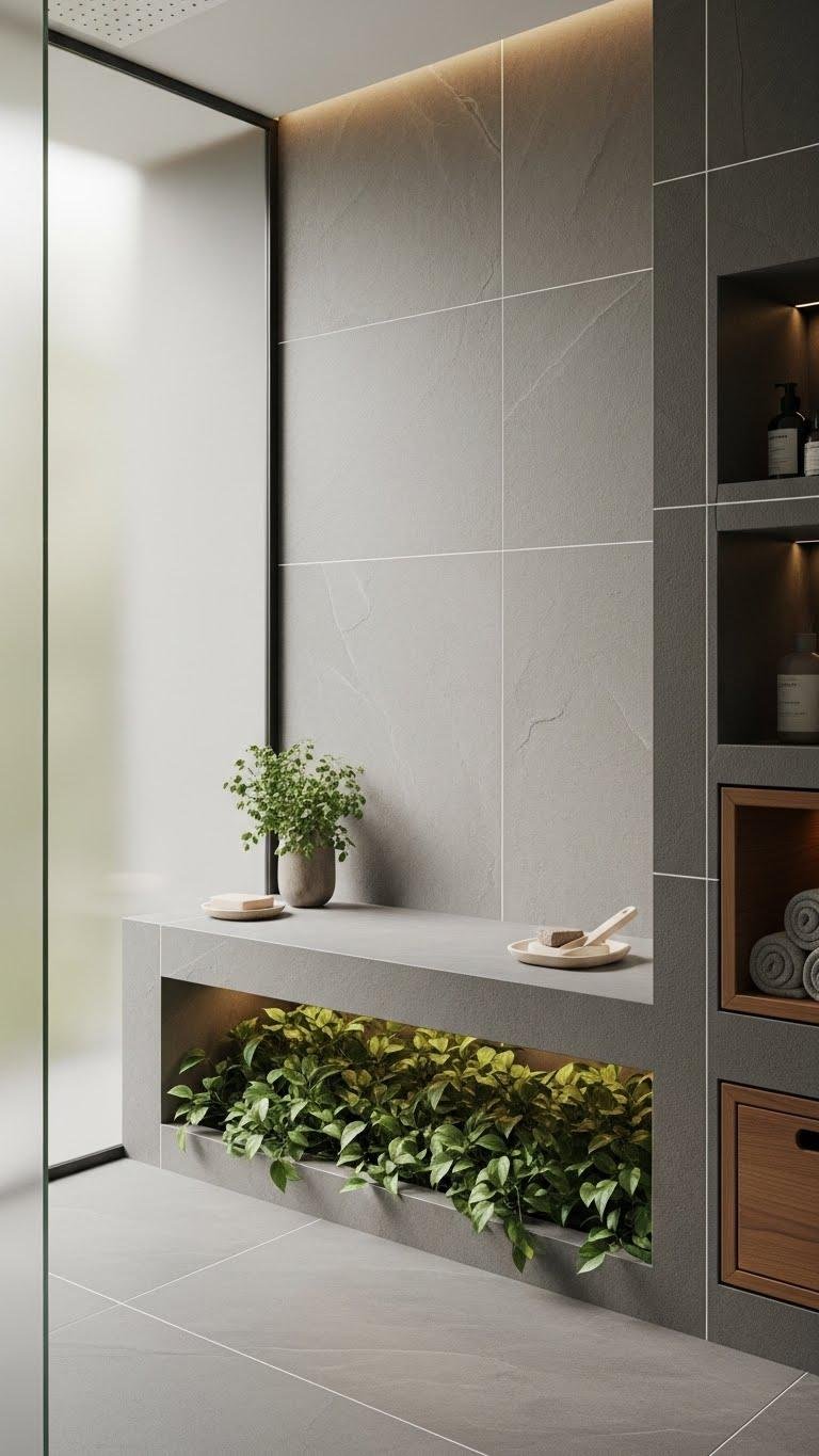 Installing a built-in shower bench transforms your shower into a restful retreat, and pairing it with moisture-loving greenery makes the space feel alive and spa-worthy.