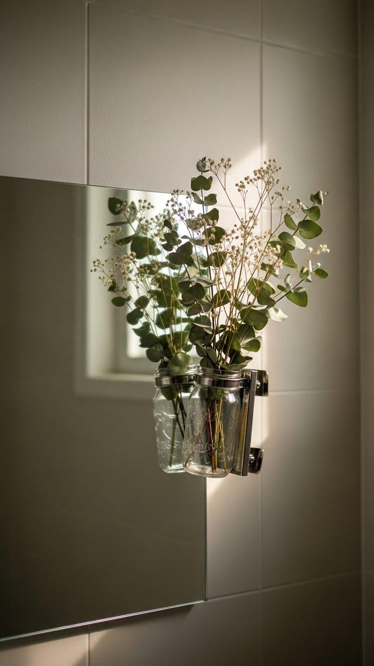 You’ll secure a sprig of dried eucalyptus or wildflowers in a mirrored masonjar or clip vase, creating a minimalist focal point. It’s effortless, reversible, and frees your bathroom from static decor.