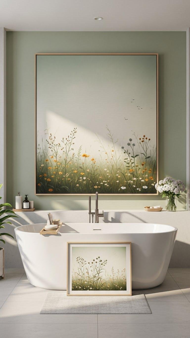 After framing your reflection with a simple bouquet, carry that quiet, organic energy to the bath by hanging a spring landscape canvas above the tub. You’ll create a liberated bathtub vignette that feels like an escape.