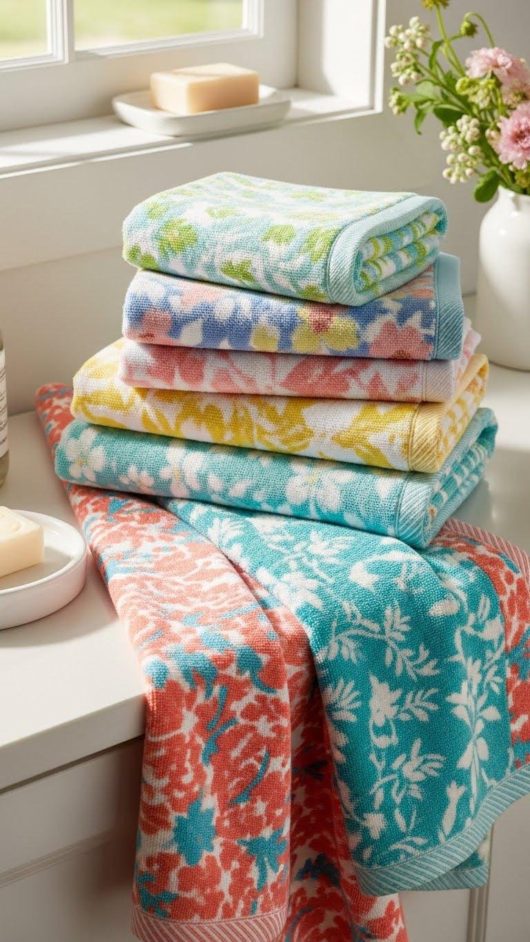 Swap plain linens for plush hand towels in cheerful prints to lift the room with minimal effort. You’ll choose textured cotton that feels indulgent and breathes easily. Pick towels with seasonal motifs to echo spring’s energy and a bold cheerful pattern to express your freedom. Contrast piping sharpens the look, letting you mix colors confidently while keeping the style effortless and curated.