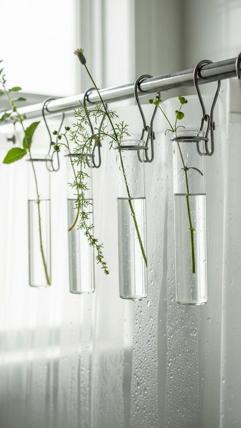 With a few glass bud vases clipped to your shower rod, you’ll turn a utilitarian strip into a vertical garden that freshens the space and lifts morning moods. Clip lightweight minimalist glassware, add single stems or sprigs of hanging greenery, and let water reflections amplify light.