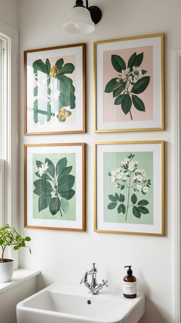 Choose a botanical palette with soft greens and sunlit neutrals, keep framing minimal, and let the art set a serene, open mood that invites daily ritual and easy breath.