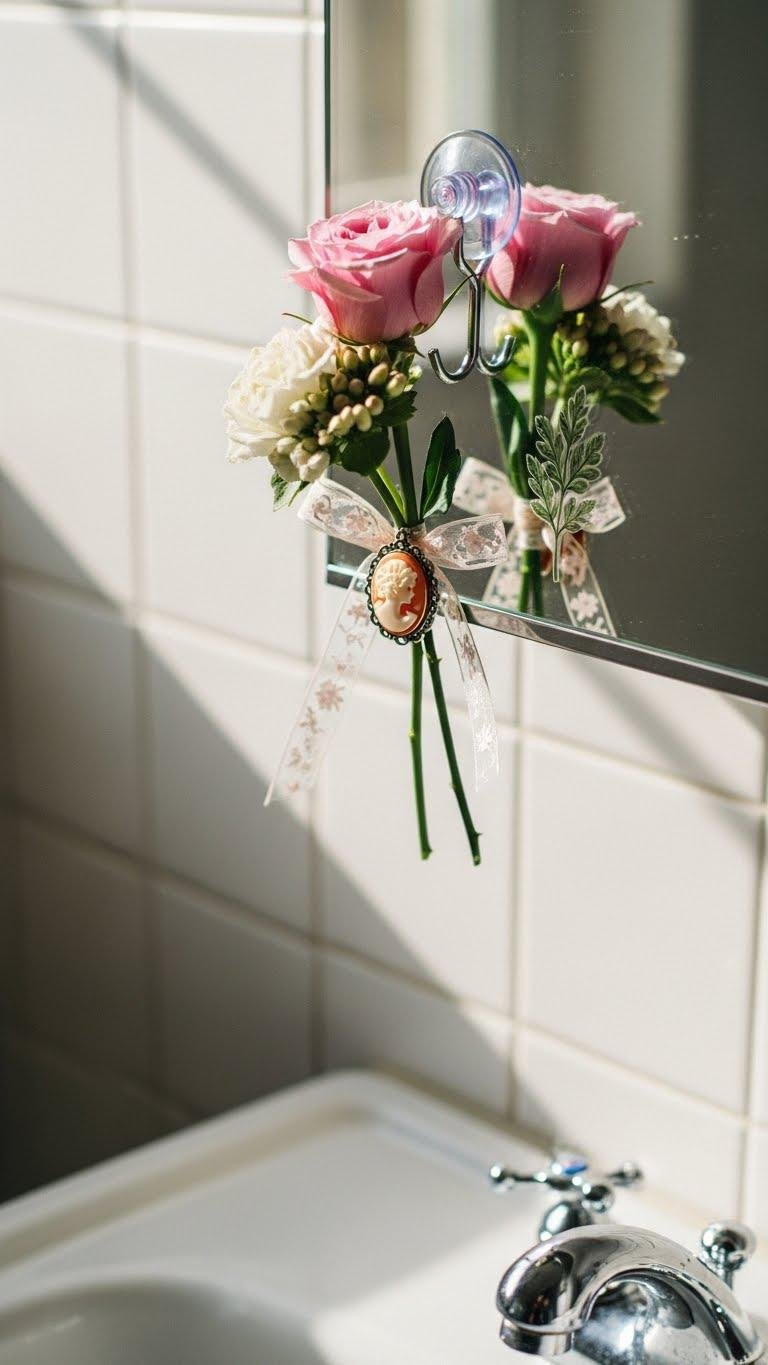 If you love the gallery-like calm of framed botanicals but want something lighter around the sink, try a single-bloom mirror bouquet hung with a suction hook. You’ll create instant charm without commitment: clip a stem, secure a vintage cameo charm to the ribbon, and place a tiny botanical decal on the mirror’s edge. It’s freeing, elegant, and effortlessly seasonal.