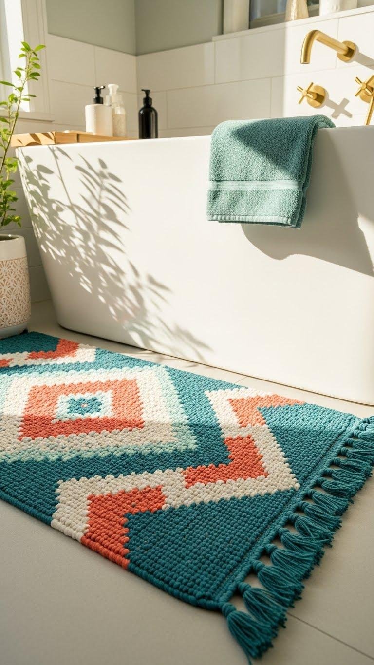 Swap out a plain mat for a vibrant patterned one and watch your bathroom lift from functional to fabulous. Choose a bold geometric rug to anchor the space; it adds confident rhythm without clutter. You’ll love how color and pattern free the room’s mood. Opt for a durable weave and playful teal tassels for personality that endures — practical, bold, liberating.