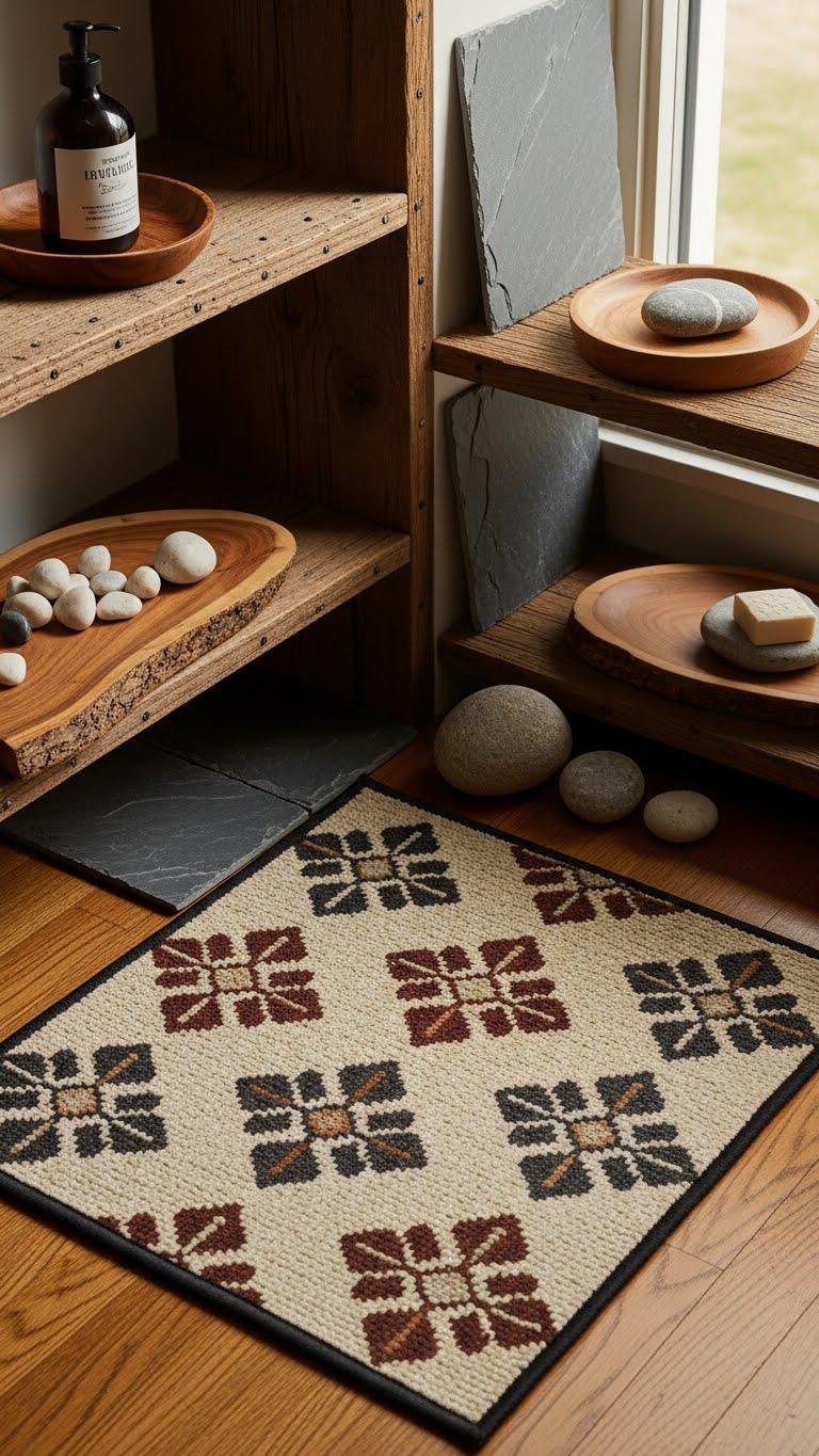 After a bold patterned mat makes the room sing, bring things back to earth with natural wood and stone accents that ground the space and add tactile warmth. You’ll choose reclaimed wood shelves for rugged charm, pair them with slate accent tiles for cool contrast, and mix live-edge trays and pebble soap dishes. The result feels honest, free, and effortlessly refined.