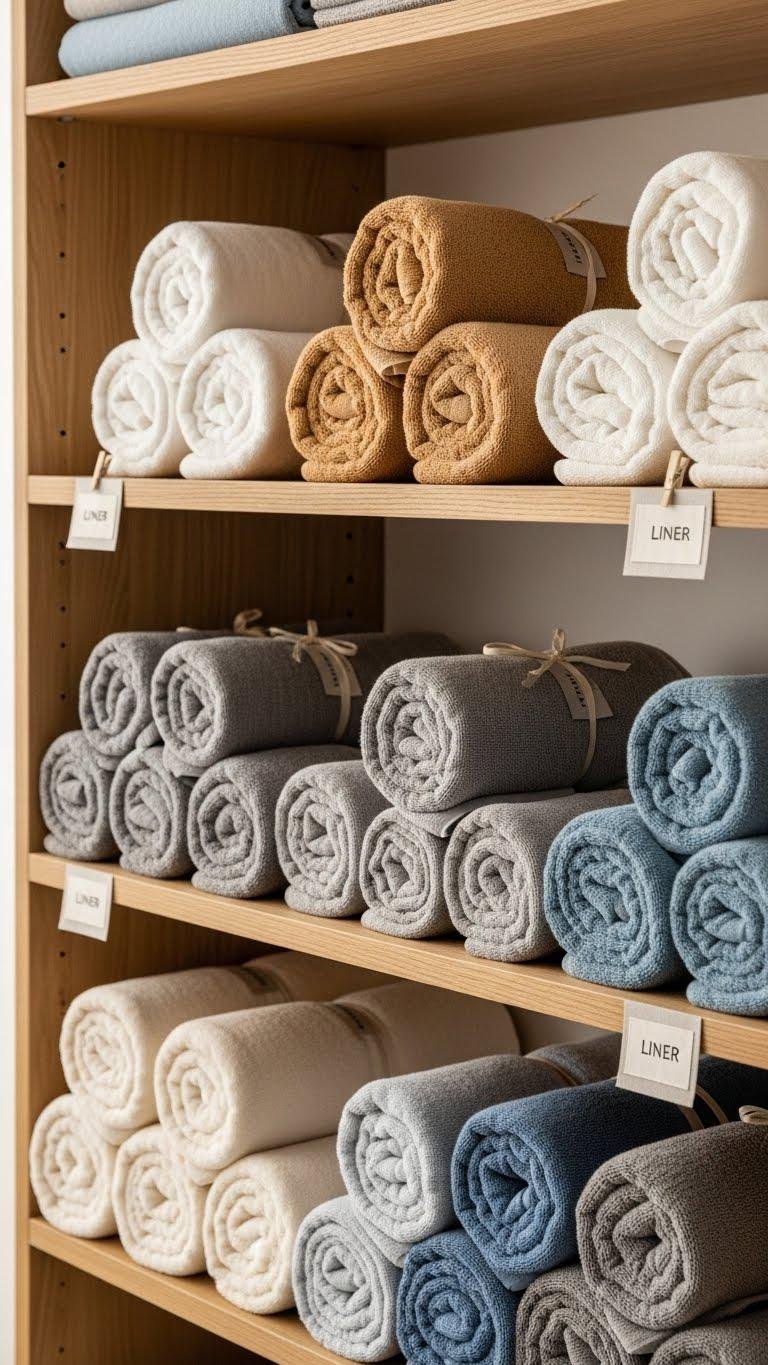 A simple roll can turn a stack of towels into a chic display that feels curated rather than cluttered. You’ll roll towels tightly, tie a rolled ribbon for a subtle accent, and arrange them by color or texture on open shelving. Add linen labels for easy use and an effortless, liberated vibe—clean, accessible, and undeniably stylish without fuss.
