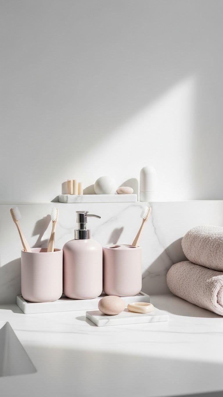 Neatly rolled towels set the tone; now bring that same calm to countertops with soap dispensers and toothbrush holders in soft pastels. Choose matte ceramic finishes for understated elegance and durability. Pair pieces with subtle marble accents to elevate minimalism without fuss. You’ll control a serene, liberated bathroom vibe—clean lines, restrained color, purposeful accessories that make daily routines feel intentional and free.