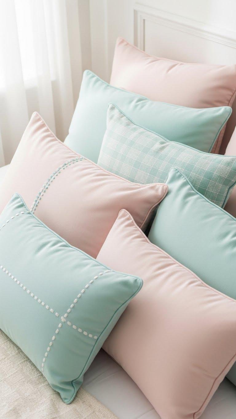 Brighten the bed with a few pastel throw pillows in blush and mint to add instant springtime charm. You’ll choose a blush mint mix for a modern, airy look and balance solids with subtle patterns. Pick pastel piped cushions to add neat edges and tactile interest. Arrange them casually so your space feels open, personal, and effortlessly free.