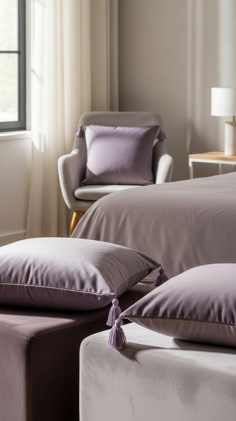 Tuck muted lavender velvet cushions into your bedding or a cozy chair to add a soft, luxe touch without overpowering the room.
