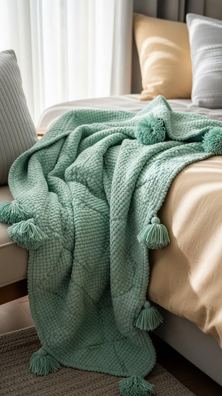 A quilted mint basket blanket brings subtle structure and a fresh pop of color to your bed or chair, its woven pattern adding tactile depth without shouting for attention. Drape it casually, letting minted pompom edges and quilted tassels peek from beneath a duvet or throw pillows.