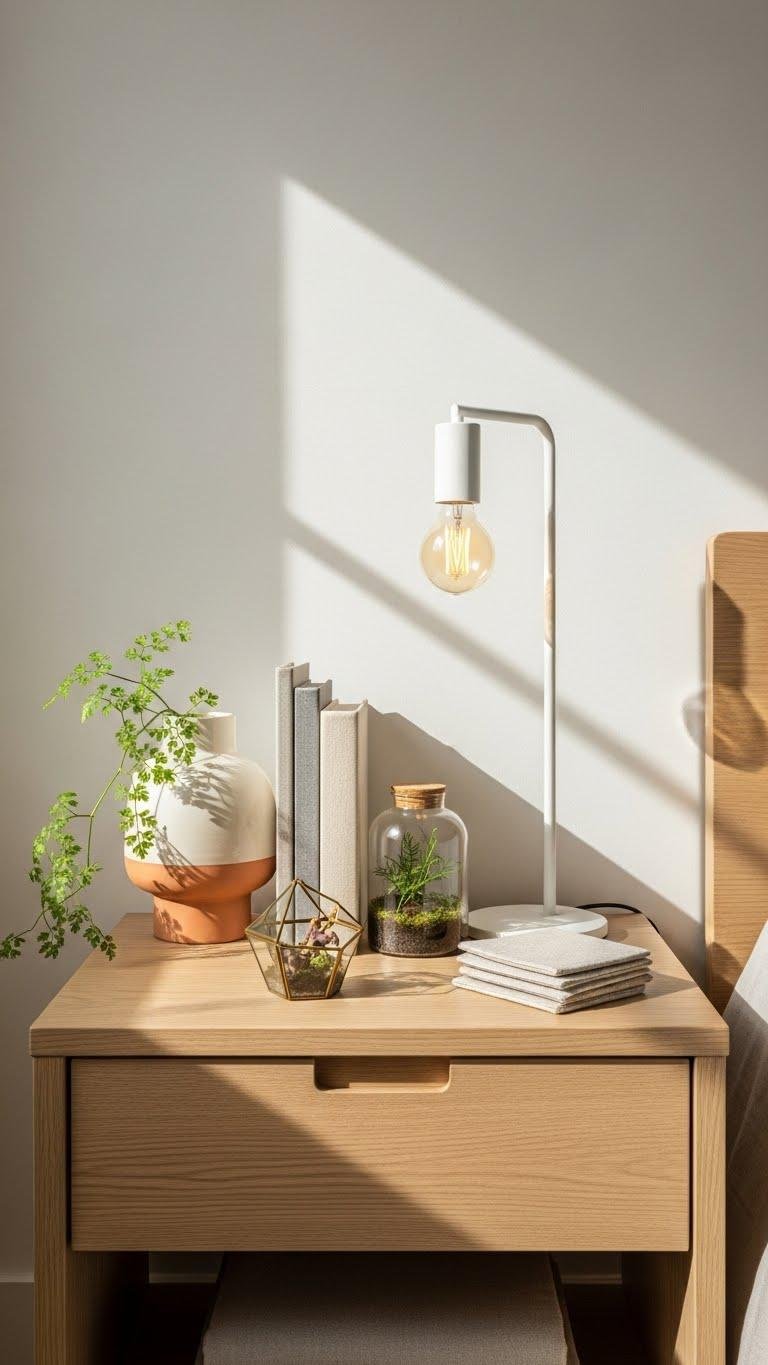 When you style nightstands for a soft-spring bedroom, let natural wood and fresh greenery do the talking: choose a simple, light-toned bedside table with visible grain, add a low ceramic vase or a terracotta pot with a single trailing plant or small fern, and balance them with a slim lamp and a stack of tactile books. Keep the look airy with a greenery pairing, a mini terrarium, and linen coasters.