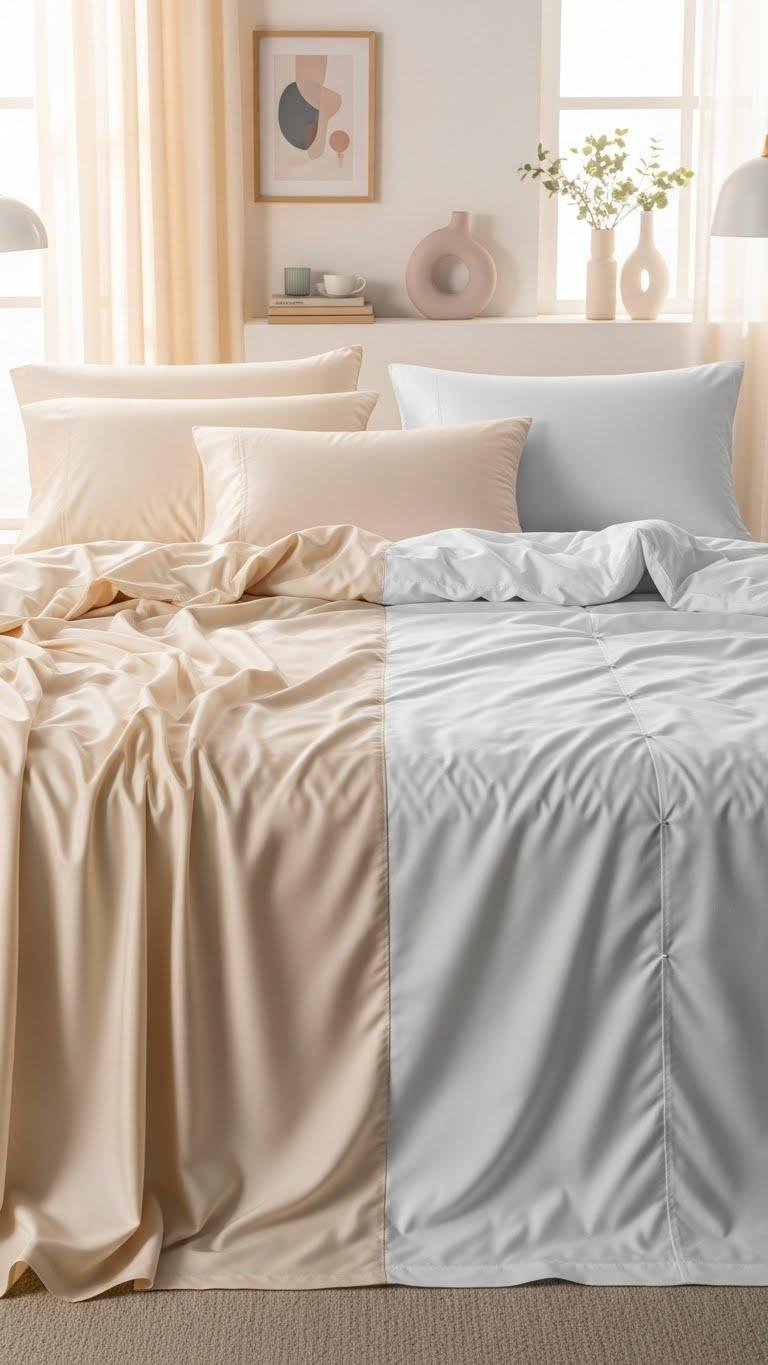 You’ll pick based on tactile mood—sateen’s soft glow or percale’s breathable weave and cooling finish—both keep your space light, modern, free.
