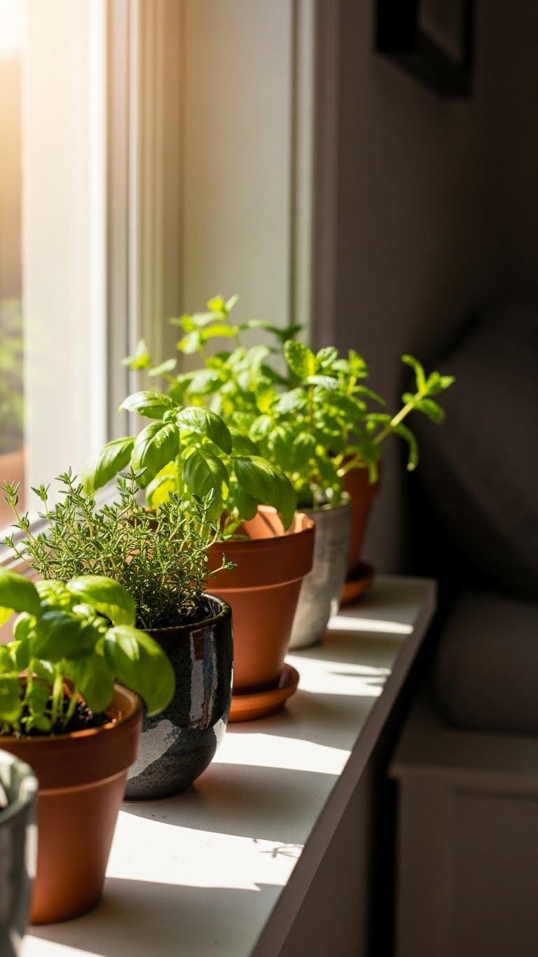 You’ll mix basil, thyme and mint for easy herb identification, vary pot heights for rhythm, and guarantee proper windowsill drainage. It’s a free, tactile detail that feels fresh and intentionally simple.