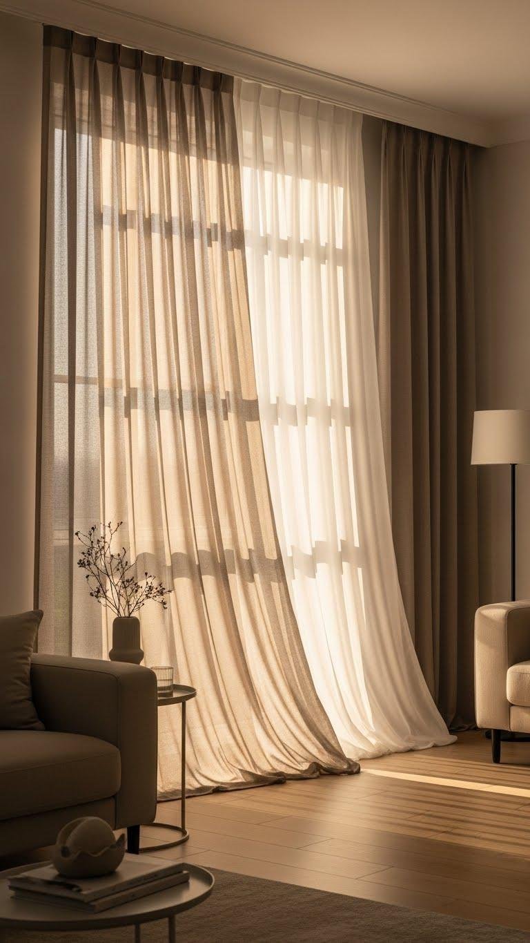 Drape sheer curtains to diffuse harsh sunlight and give the room a soft, lived-in glow. You’ll layer soft sheers for instant layered translucency, pairing lightweight panels with a slightly denser voile. Hang them high and wide so light spills gently, edges brushing the floor. The effect feels airy and liberated, offering privacy without shutting the world out — minimal, modern, and calm.