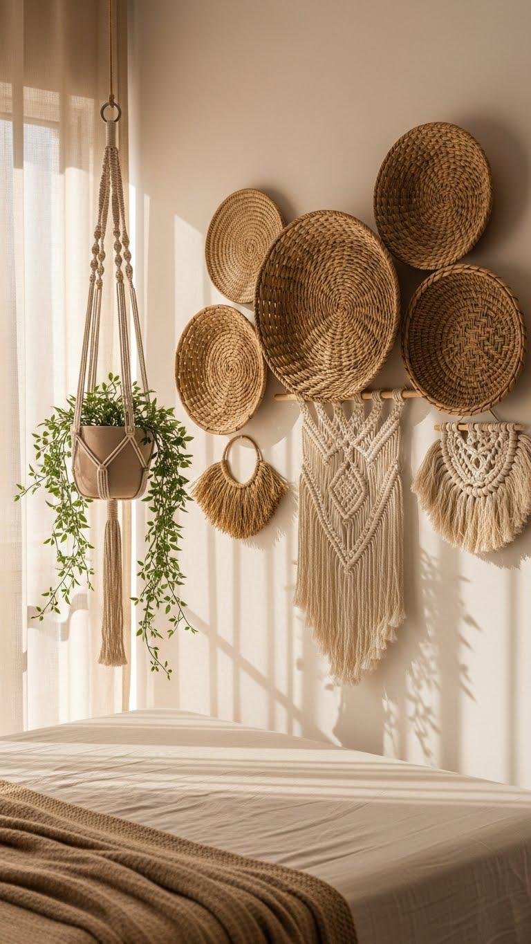 Bringing woven wall baskets and macramé into your bedroom instantly adds tactile warmth and visual rhythm without crowding the space. You’ll mix handwoven textures and natural fibers to craft airy focal points—cluster baskets above the bed, hang a macramé plant cradle, or layer pieces for depth.