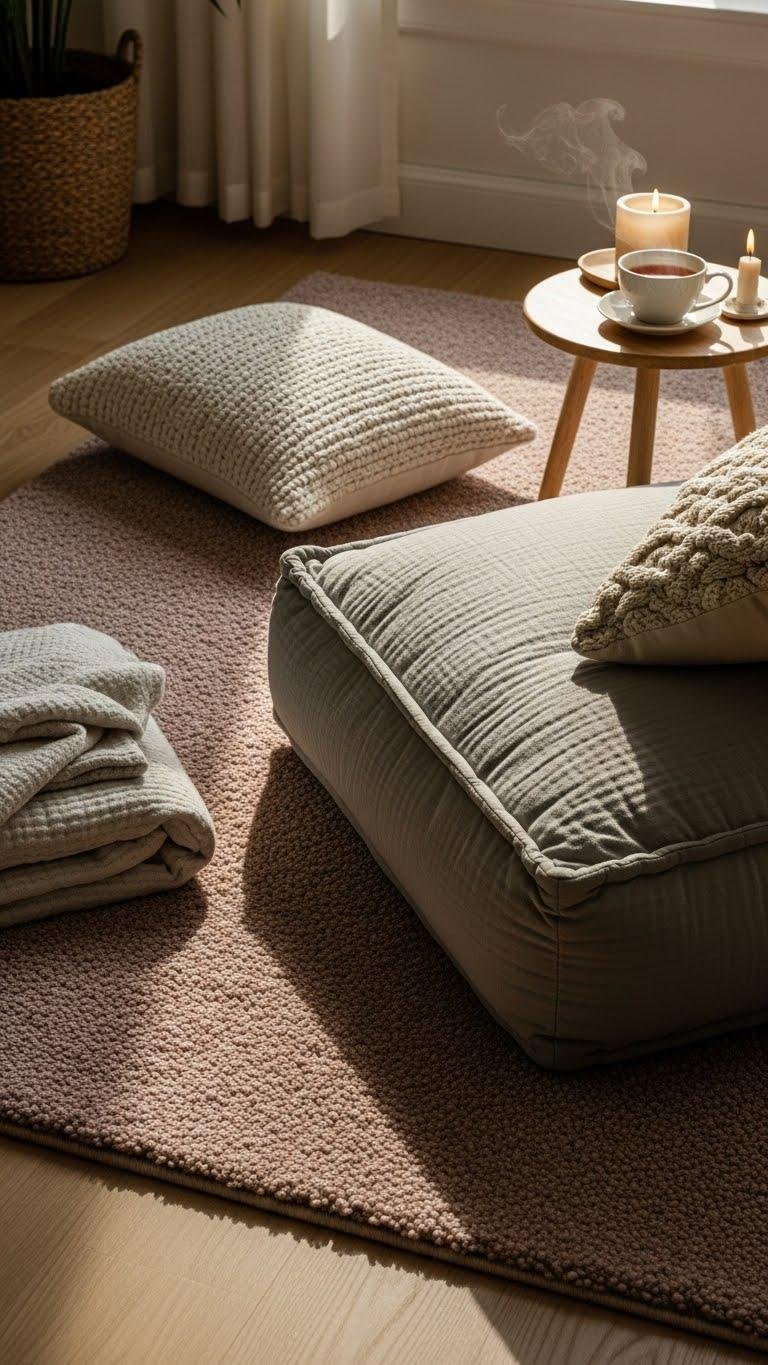Add a small side table for soft tea, a candle, and a lightweight blanket to keep the corner free and peaceful.