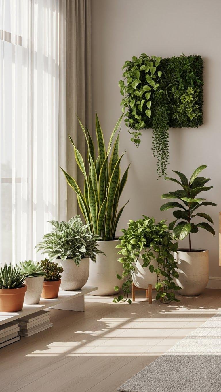 You’ll mix statement pots, a compact living walls panel, and clusters of air purifying succulents.