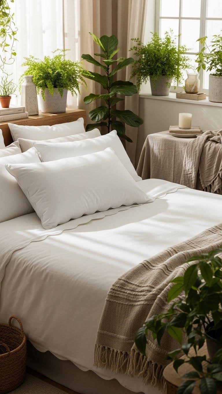 After grounding the space with greenery, anchor your bed with scalloped white shams to keep the look fresh and airy. You’ll love how crisp scallops create subtle ornament without clutter, offering a calm focal point.