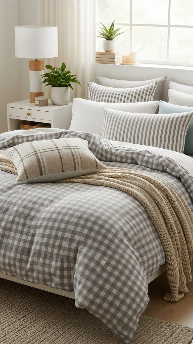 You can mix and match scale—larger gingham on bedding, slim stripes on pillows—to introduce subtle pattern contrast without clutter.