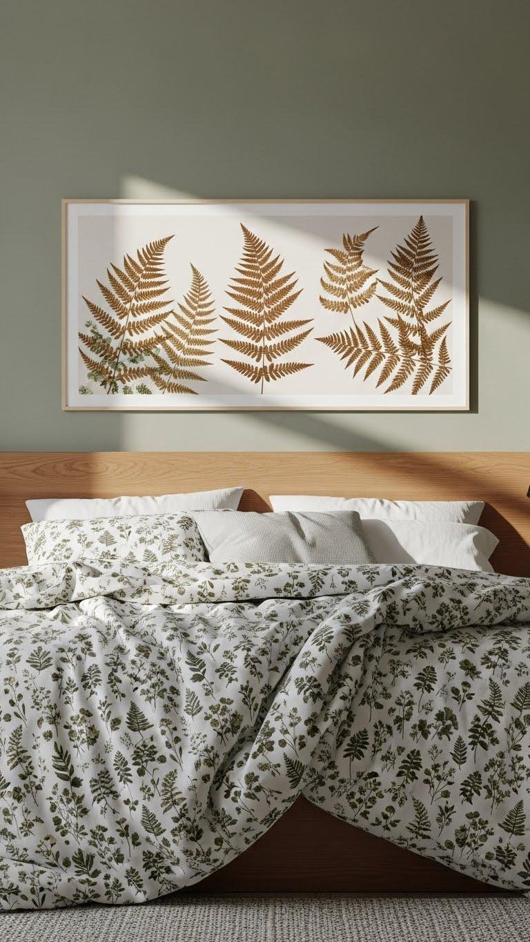Bring a botanical print above the bed to anchor your layered patterns with a calm, organic focal point. Choose framed fernprints or mixed-scale art to echo your textiles; keep frames slim and finishes warm. You’ll balance color and negative space, letting layered botanicals breathe without clutter. It’s an effortless statement that frees the room visually, tying pattern play into serene spring energy.