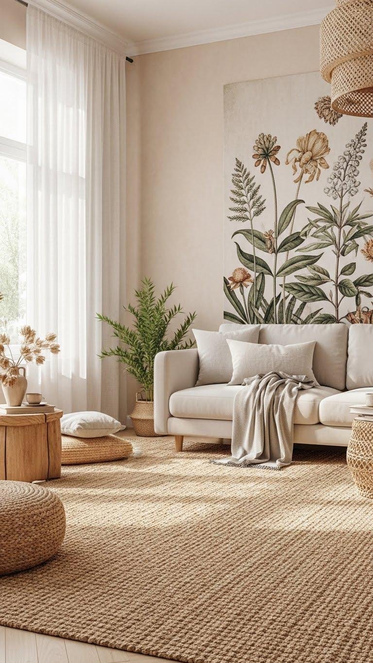 Pairing an oversized botanical print with a natural-fiber jute rug will anchor the room and reinforce that calm, organic vibe. You’ll choose jute for its texture and durability, blending natural fibers with neutral tones to create a grounded, airy palette. Layer sleek furniture and breezy textiles, keep accessories minimal, and let the rug define seating without constraining your free, easy flow.