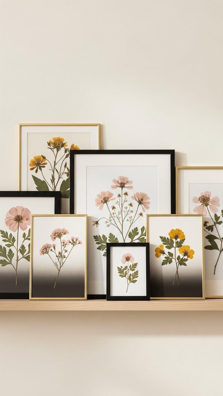 Gather a small collection of pressed flowers and frames that speak to a restrained, modern aesthetic, then arrange them on a single shelf to create an artful, seasonal vignette. You’ll mix vintage botanical prints with minimalist frames, balance sizes, and use ombre mounting to add subtle depth. Let negative space breathe; rotate pieces seasonally so the display feels free and intentionally curated.