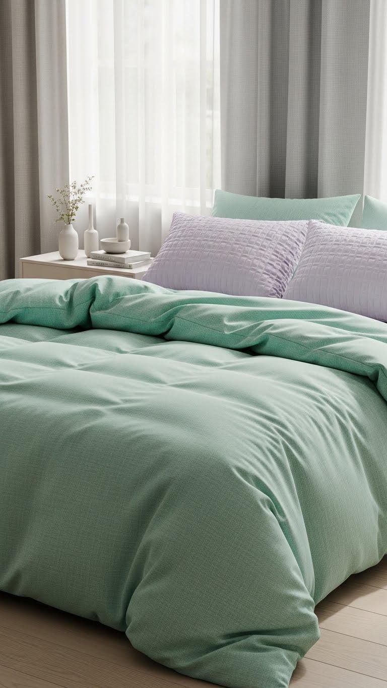 You’ll choose a mint duvet with crisp weave, pair it with a textured lavender pillow, and keep accessories minimal. This fresh palette frees your space, brightens mornings, and makes the bedroom feel calm, open, and wearable.
