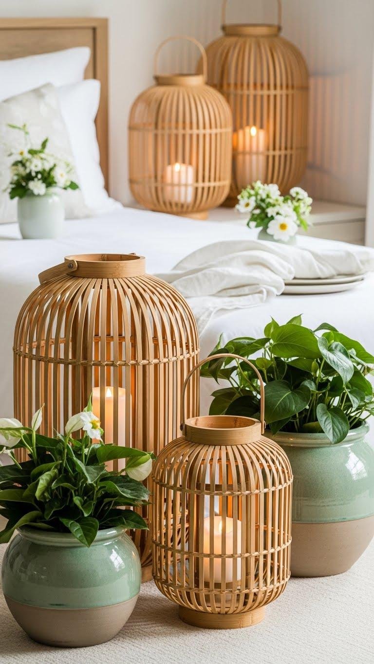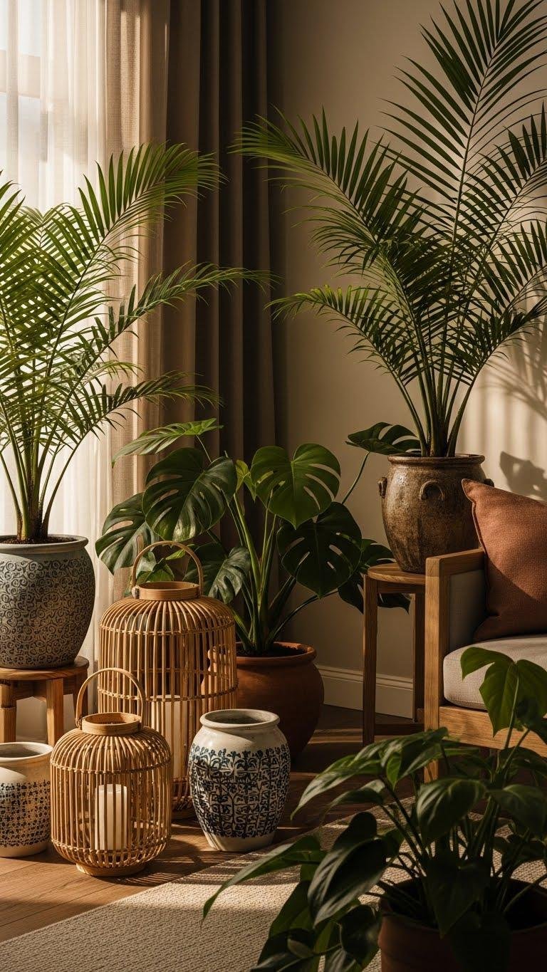 Pair those bamboo lanterns and glazed planters with a few potted palms or bold-leaf specimens to amplify the room’s organic calm and add vertical energy. Place potted fanpalms in corners to lift sightlines, then balance with an oversized philodendron near seating. You’ll enjoy sculptural silhouettes, improved airiness, and a liberated, fresh vibe that feels curated yet effortless.