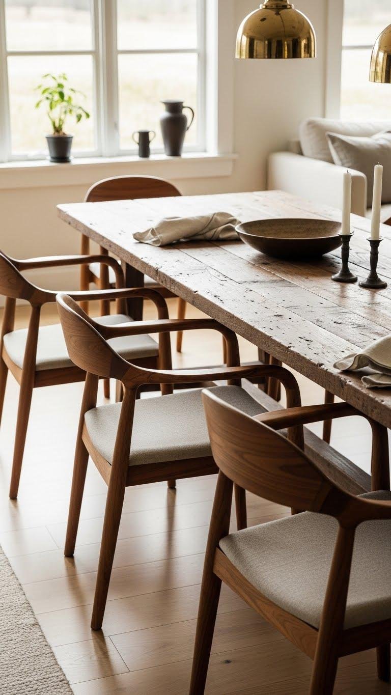 Often, you’ll find mid-century chairs bring a sleek, sculptural counterpoint to a rustic table’s weathered warmth, and that contrast creates a layered, intentional look. Pair teak armchairs with a reclaimed plank table, let brass accents punctuate lighting or hardware, and keep textiles minimal. You’ll balance clean lines and lived-in texture, creating a liberated, curated space that feels effortless and personal.