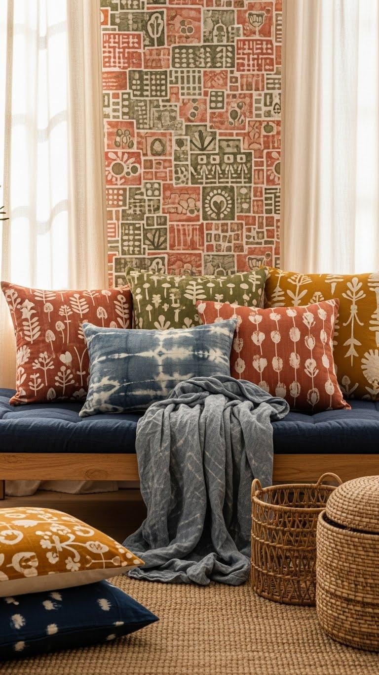 Bring in block-print fabrics in warm, earthy hues to root your spring palette in handcrafted charm and subtle texture. Pair block print wallpapers as focal accents with indigo dyed cushions for contrast, and layer linen throws and rattan baskets to keep the look relaxed. You’ll curate an inviting, liberated room that feels artisanal, modern, and effortlessly personal without overdecorating.
