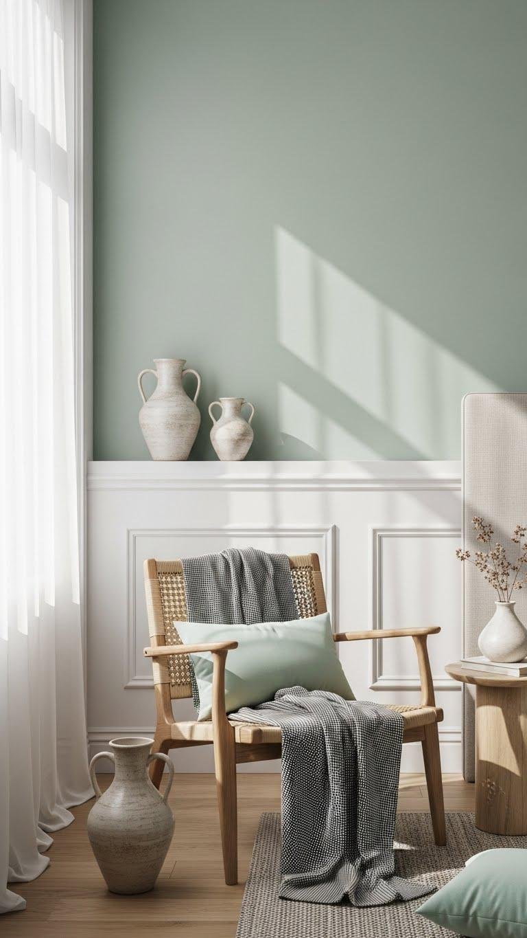 You’ll use sage accents to create a grounded, airy feel; pair with crisp white, natural wood, or subtle mint trim for a modern, liberated look that invites relaxed, intentional living.