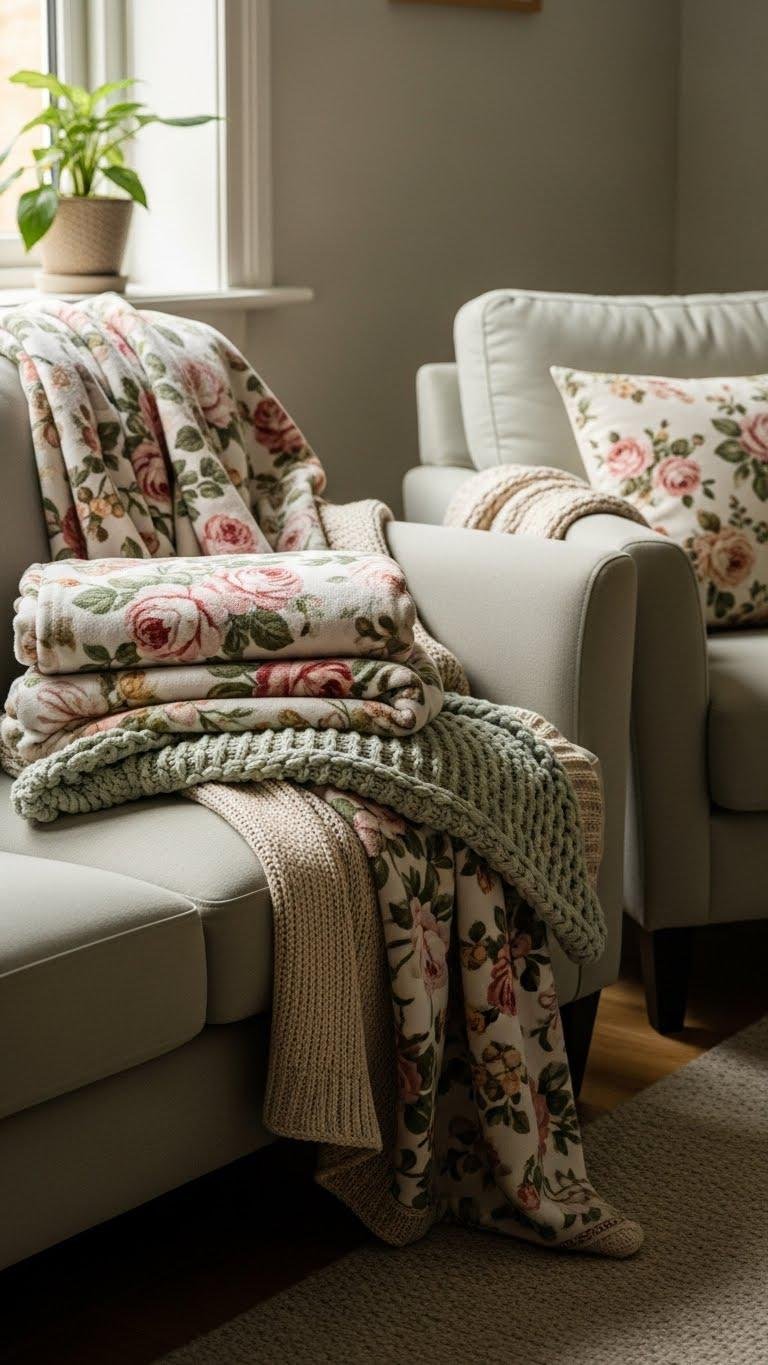 Soft sage sets a calm foundation, and floral throw blankets add the seasonal burst that makes a room feel welcoming without overpowering that grounded palette. Choose a vintage floral pattern for personality, and layer a cozy knit for texture and warmth. Drape casually over a sofa or chair to invite lounging, express individuality, and refresh your space with effortless, liberated style.