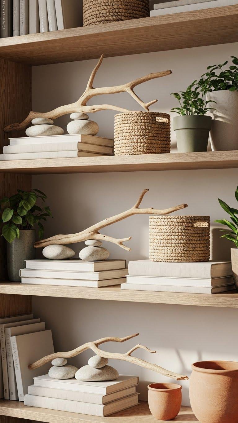 You’ll create driftwood vignettes, anchor linen wrapped books, layer small plants and metal accents, and let negative space breathe—keeping the display relaxed, modern, and effortlessly personal.