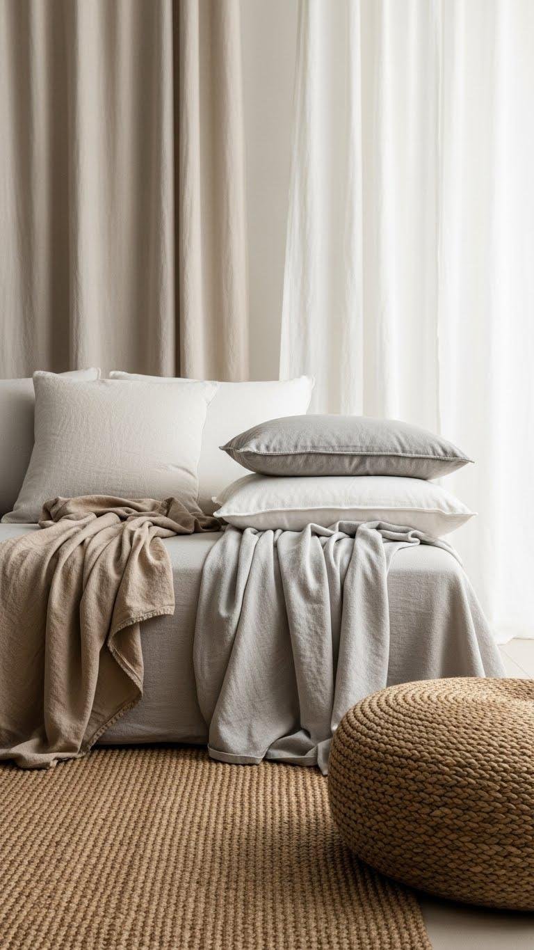 Often you’ll find that mixing jute, cotton, and linen gives a room instant depth without feeling fussy; start by combining a coarse jute rug or woven basket with crisp linen curtains and soft cotton throws to create contrast in scale and hand. Add a jute pouf, scatter linen napkins as casual placemats, and choose muted tones so your space breathes freely and modernly.