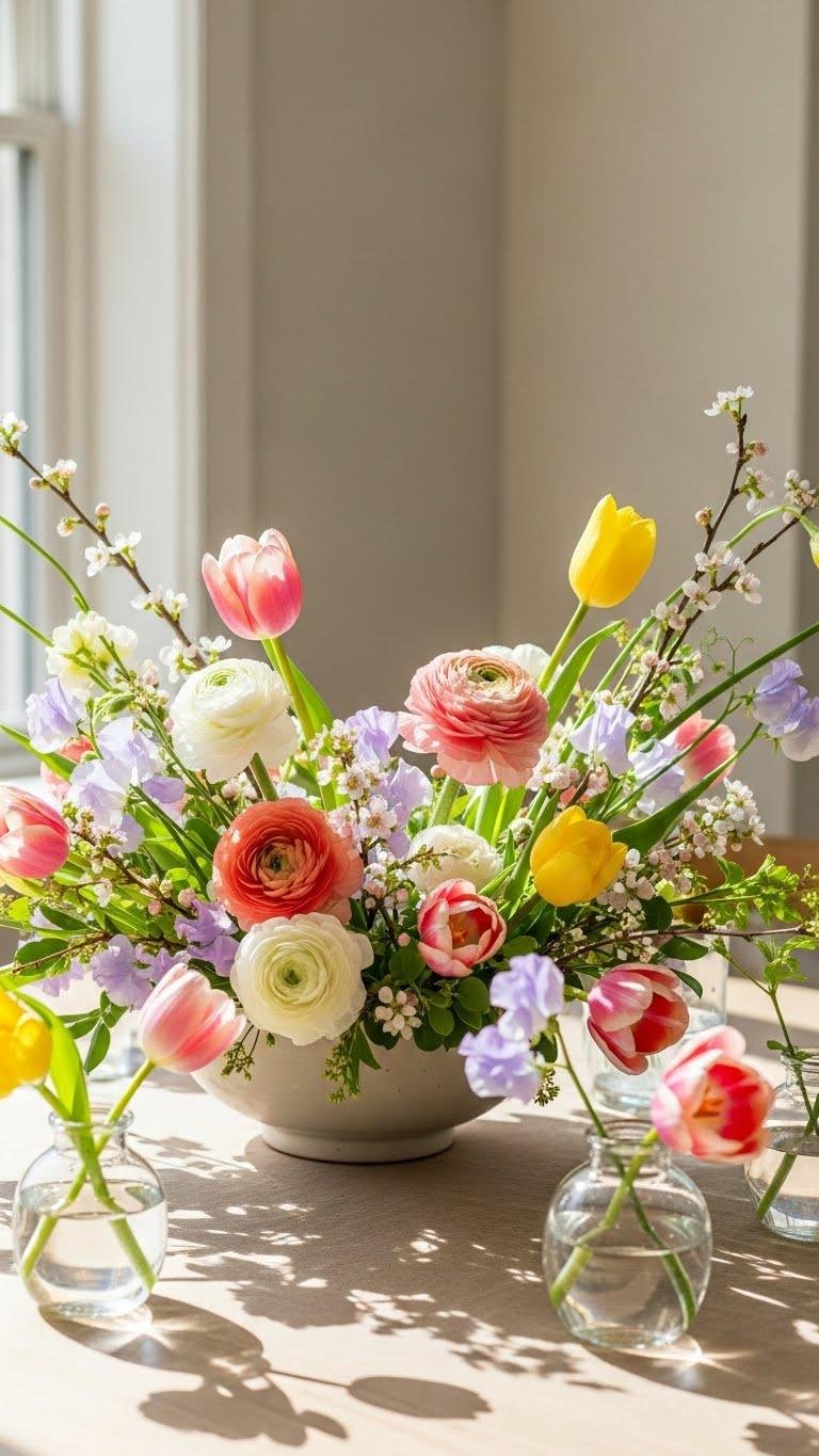 Brighten your table with a fresh spring centerpiece that feels effortless yet thoughtfully styled: start with a low, wide vessel to keep conversation flowing and build upward with a loose mix of seasonal blooms—tulips, ranunculus, sweet peas, and sprigs of blossom—so stems read natural rather than overly arranged. Scatter small bud vases nearby, vary heights, and let airy foliage loosen the composition for a liberated, modern look.