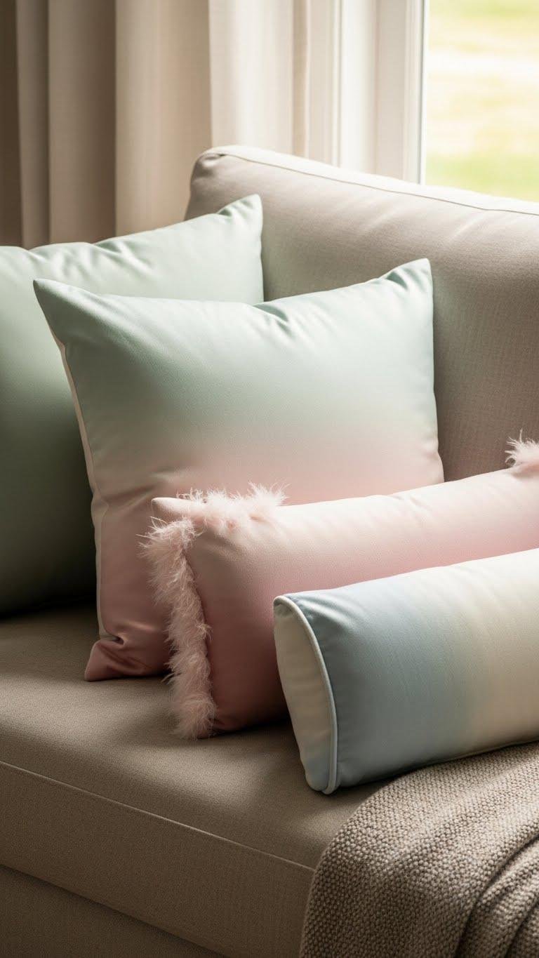 Bring in soft pastel throw pillows to gently lift your seating and set a light, spring-ready tone. Layer silk pastel textures with ombre pillows for subtle gradient interest, and mix square and mini bolster shapes for relaxed structure. Choose feather inserts for plush, movable comfort that invites lounging. Keep colors airy—sage, blush, sky—to evoke openness and effortless seasonal refresh.