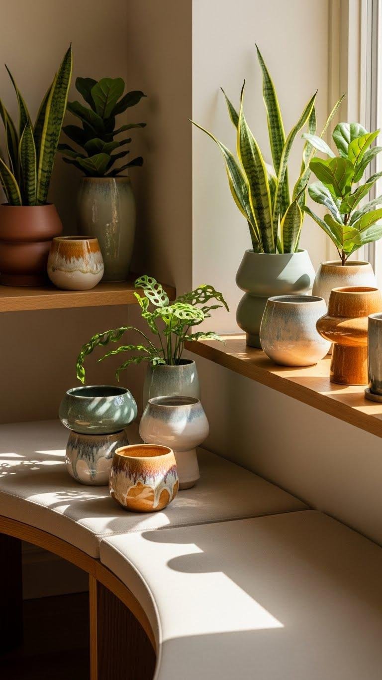 You’ll choose handmade planters with subtle, earthy glazes and varied glazed textures that catch light. Arrange them in clusters or singly on shelves and windowsills, pairing sculptural pots with sculpted foliage so your space feels liberated, curated, and quietly modern.