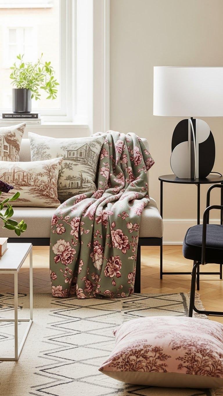 Mix vintage toile cushions with sleek sofas, then layer a throw in muted blooms. Let modern geometrics on a rug or lamp anchor the arrangement so you can express freedom through curated contrast, confident color choices, and purposeful scale.