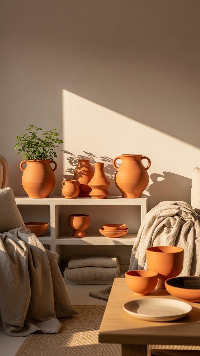 Warm up your spring scheme with light terracotta accents that quietly shift a room from cool minimalism to sun-kissed comfort. You’ll mix terracotta planters with linen throws, open shelving, and sculptural ceramics in warm terracotta tones to create airy, relaxed layers.