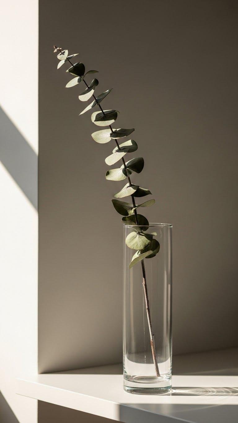 A single eucalyptus stem in a clear glass vase gives any shelf or table an instant, modern lift—its sculptural silhouette and subtle scent add calm without clutter.
