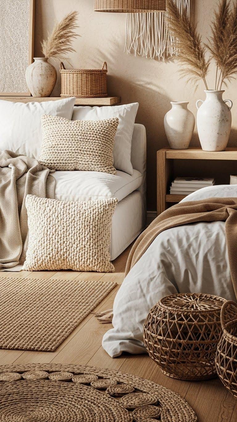 Embrace texture contrast—soft throws against coarse jute, smooth ceramics beside knubby knit pillows—to create a free, relaxed vibe that’s effortlessly stylish and inviting.