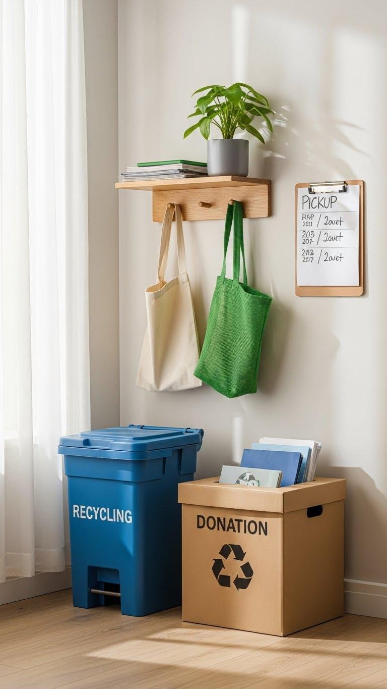 Carve out a tidy corner for a small recycling and donation station so you can quickly sort items without cluttering your living spaces. Set a labeled recycling bin and a box for donation drop off; keep a slim shelf for bags and a clipboard for pickup dates. You’ll streamline decisions, reduce waste, and free up space with minimal effort and style.